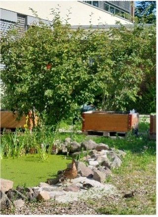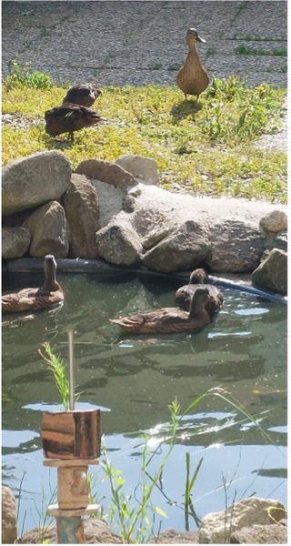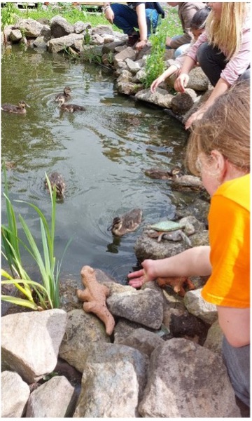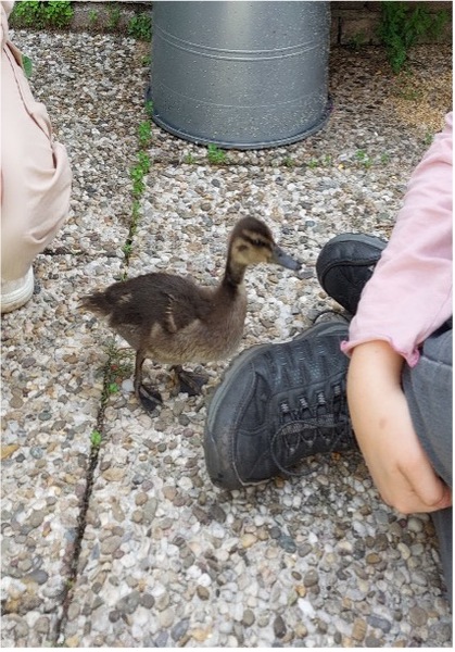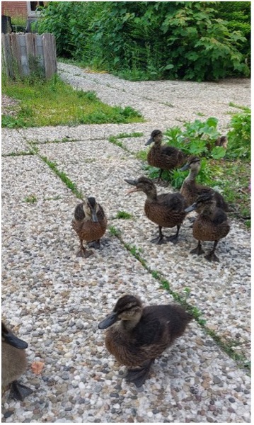 Da der Innenhof nicht genügend Nahrung für uns bietet, werden wir hier täglich mit Futter und anderen Leckereien umsorgt. Es gibt Kükenfutter, getrocknete Mehlwürmer, Bruchmais und ab und zu Salat. Jeden Tag besuchen uns Kinder aus unterschiedlichen Klassen und freuen sich über uns und helfen bei der Fütterung. Sie haben meinen Küken sogar Namen gegeben: Turbo, Speedy, Blindi, Luna, Momo…. ich habe sie nicht alle behalten! Wenn sie dann acht bis neun Wochen alt sind, können sie fliegen und dann mit mir den Innenhof in die Freiheit verlassen.