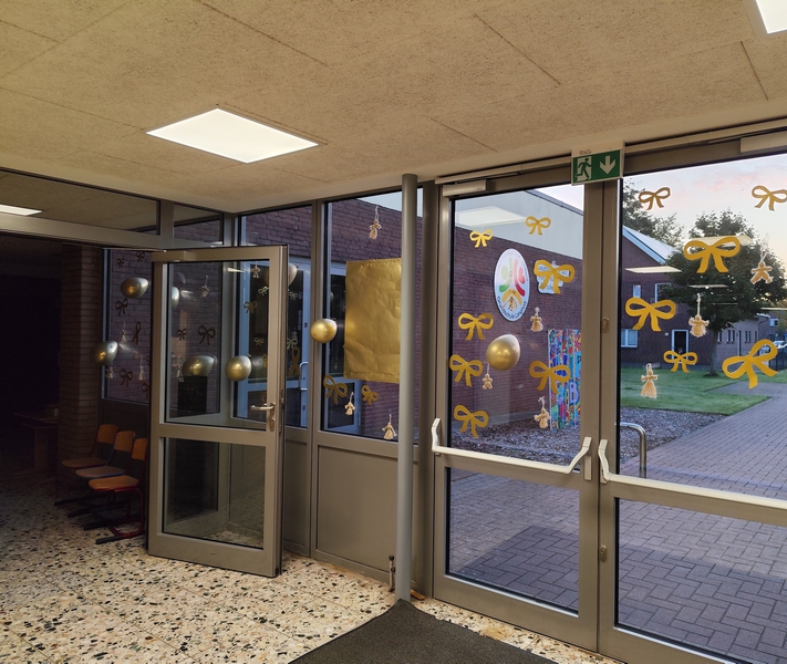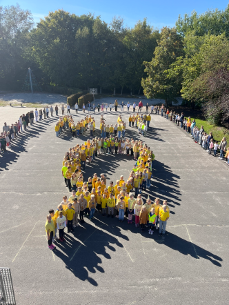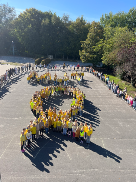 Als sichtbares Zeichen der Solidarität bastelten die Kinder goldene Schleifen und schmückten damit den Eingangsbereich. Gold gilt weltweit als Farbe der Kinderkrebsaufklärung und steht für Stärke, Mut und Hoffnung.Darüber hinaus gestalteten die Schülerinnen und Schüler Mutkarten und fertigten Armbänder an. Die Mutkarten und Armbänder wurden an Flugkraft übergeben. Diese kleinen Gesten sollen Betroffenen und ihren Familien zeigen, dass sie nicht allein sind und dass die Schulgemeinschaft Anteil nimmt. Des Weiteren bildeten alle Schülerinnen und Schüler gemeinsam auf dem Schulhof eine Menschenschleife und das Wort MUT zum Kinderkrebsmonat.
